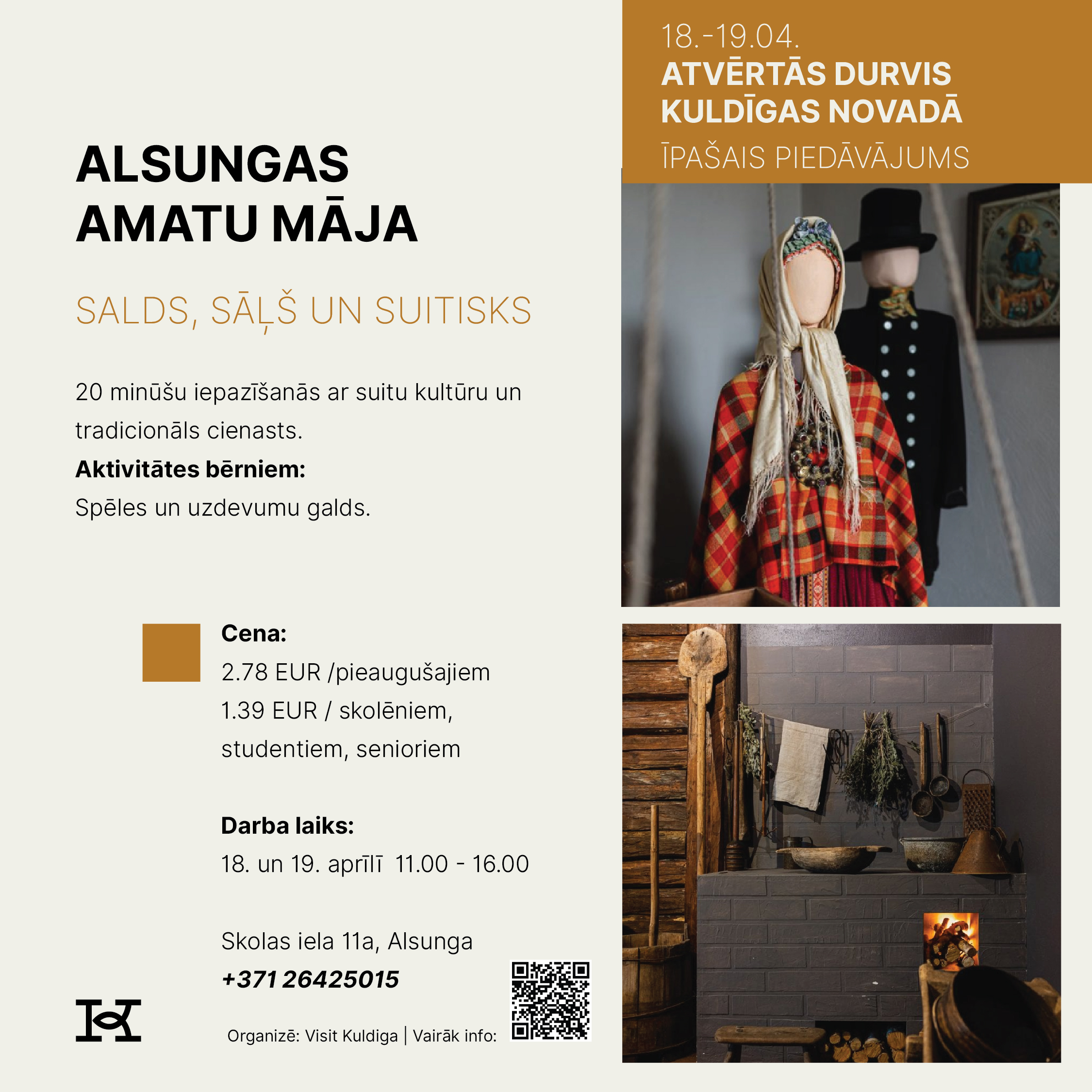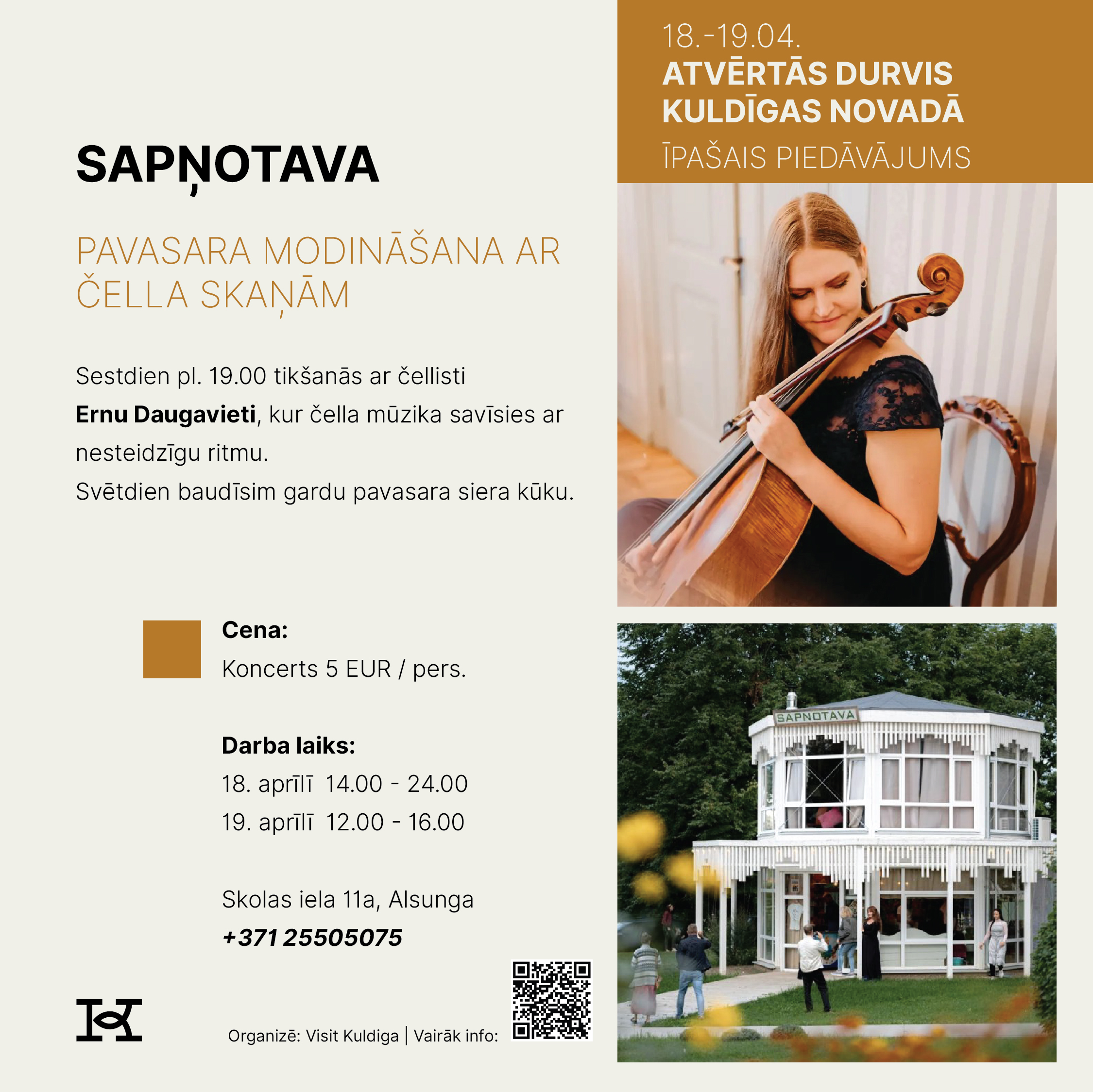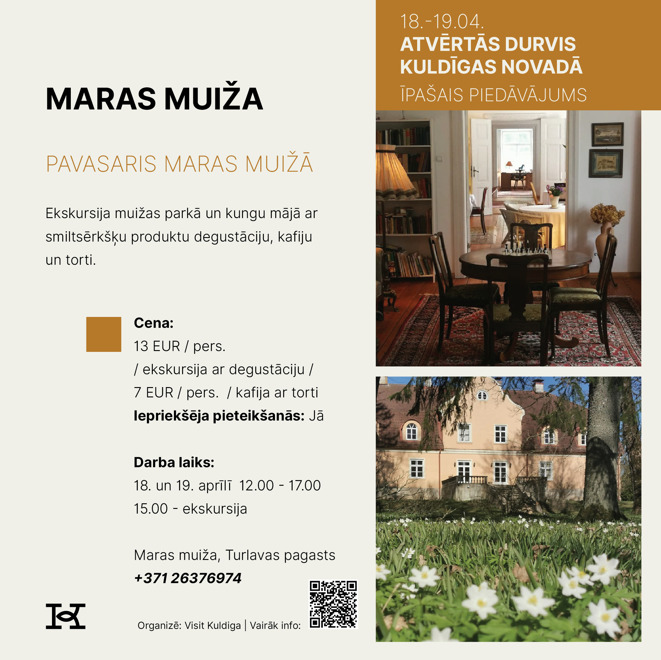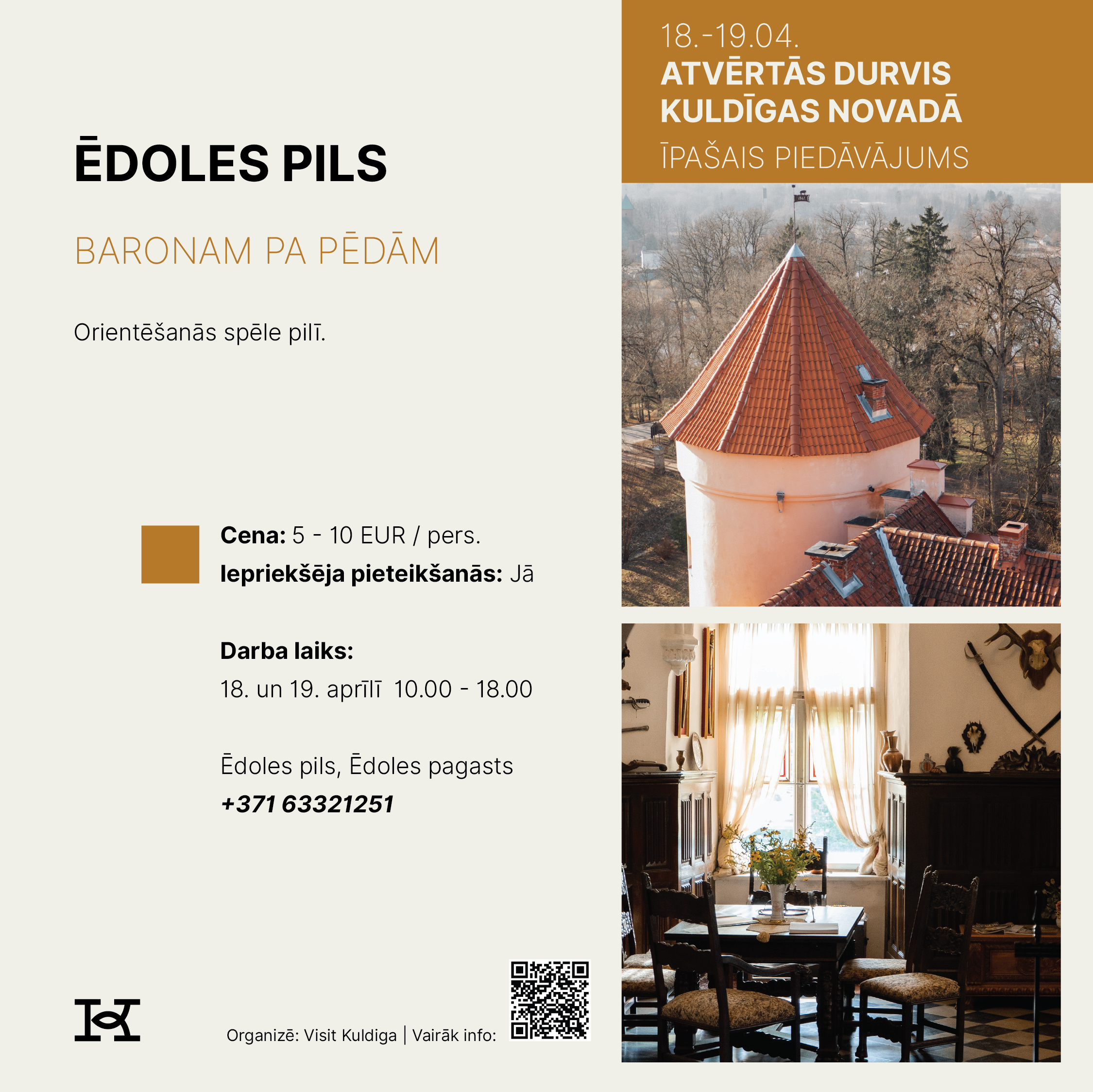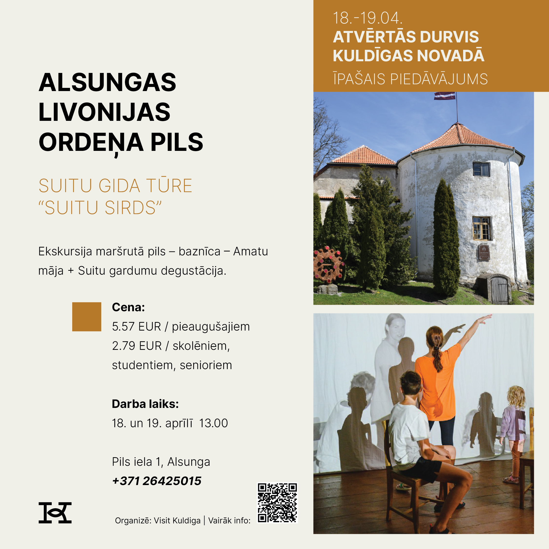 18. un 19. aprīlī Kuldīgas novads aicina doties izzinošā un pavasarīgā ceļojumā, iepazīstot novada tūrisma piedāvājumu Atvērto durvju dienās. Divu dienu garumā apskates vietas, muzeji, darbnīcas, saimniecības, naktsmītnes un aktīvās atpūtas piedāvātāji sagatavos īpašus sezonas atklāšanas notikumus un akcijas piedāvājumus, kas būs pieejami tikai šajā nedēļas nogalē.