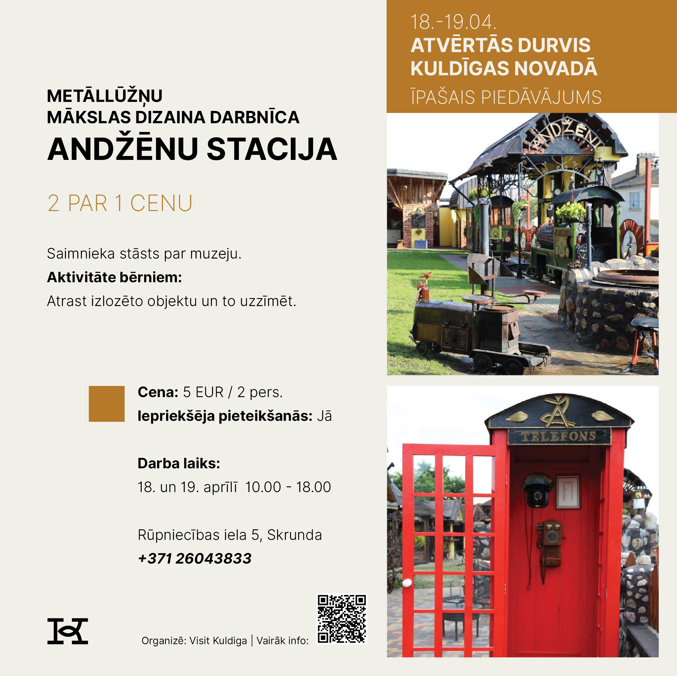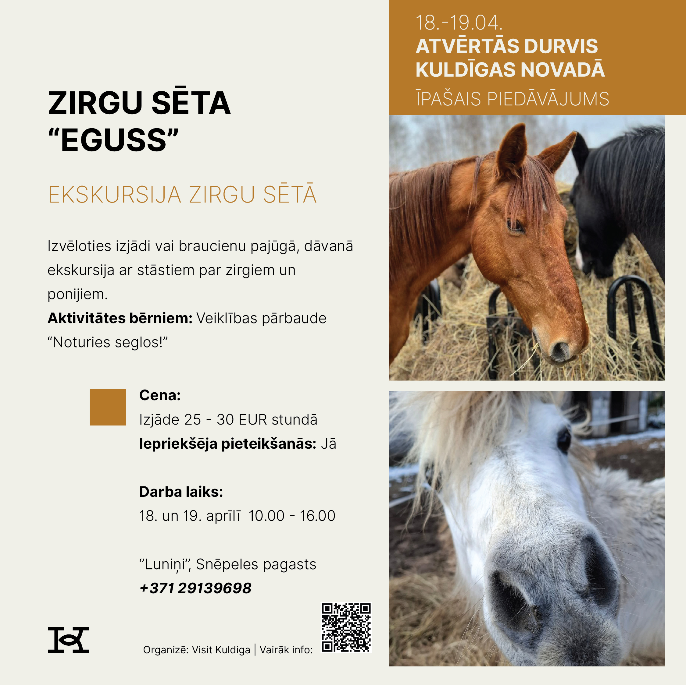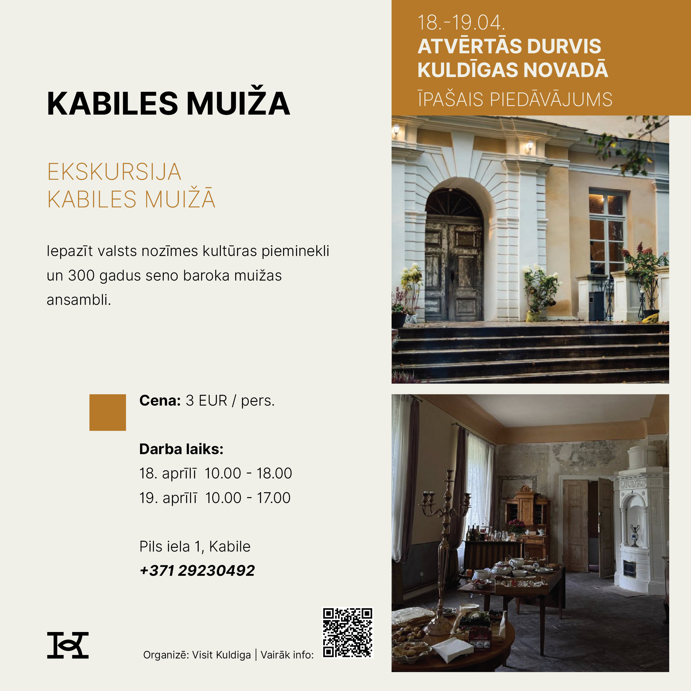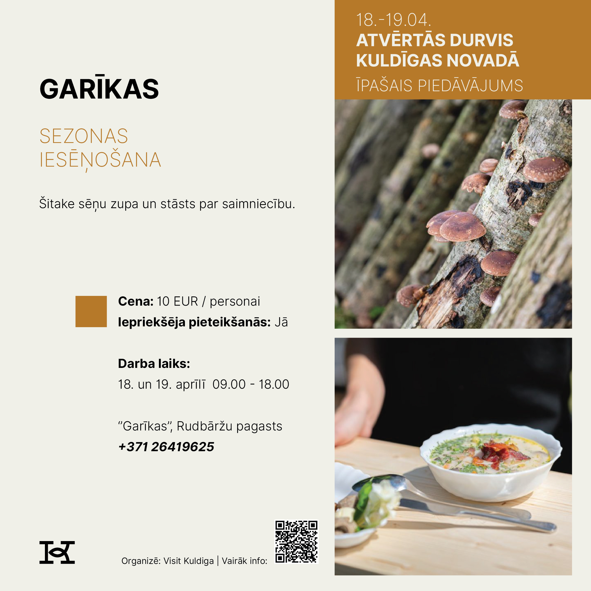 18. un 19. aprīlī Kuldīgas novads aicina doties izzinošā un pavasarīgā ceļojumā, iepazīstot novada tūrisma piedāvājumu Atvērto durvju dienās. Divu dienu garumā apskates vietas, muzeji, darbnīcas, saimniecības, naktsmītnes un aktīvās atpūtas piedāvātāji sagatavos īpašus sezonas atklāšanas notikumus un akcijas piedāvājumus, kas būs pieejami tikai šajā nedēļas nogalē.