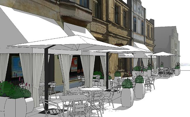 - vizuālo risinājumu (skici, foto), atainojot ielu tirdzniecības vietas aprīkojumu, detaļu dizainu (mēbeles, saulessargi, lietussargi, norobežojošie elementi, apgaismojums, puķu kastes un citi elementi);