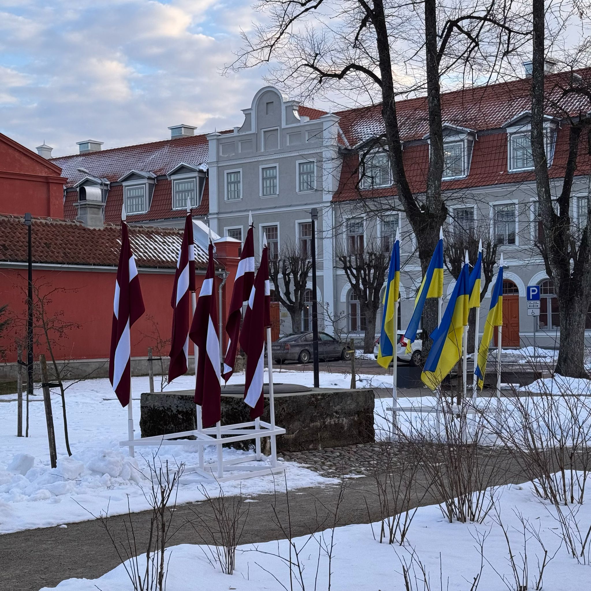 Ukrainas un Latvijas karogi rotā arī piemiņas vietu Liepājas ielā 39, sūtot spēku un paužot atbalstu ukraiņu cīņai par neatkarību un savu zemi.