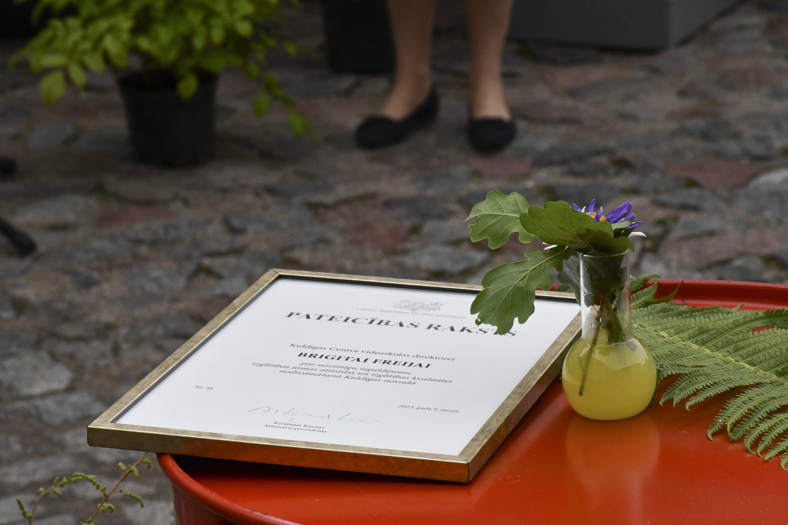 Paldies vārdus Brigitai Freijai veltīja Kuldīgas novada domes vadība – gan pasniedzot Ministru prezidenta Krišjāņa Kariņa pateicības rakstu par nozīmīgu ieguldījumu izglītības jomas attīstībā un izglītības kvalitātes nodrošināšanu Kuldīgas novadā, gan veltot pateicības vārdus: ”Pāršķirto nākamo lapaspusi un ejot nākamajā nodaļā, gribam tev dot līdzi Valda Līcīša gleznu, kur attēlota Venta. Lai tad, kad ir slikti laika apstākļi un nevari aiziet līdz Ventai, tu vari smelties spēku no gleznainās ainavas. Vēlamies teikt lielu paldies par ieguldījumu ne tikai skolas, bet visa novada labā. Lai viss piepildās un izdodas atpūsties – paldies, ka esi!” teica domes priekšsēdētāja Inese Astaševska.