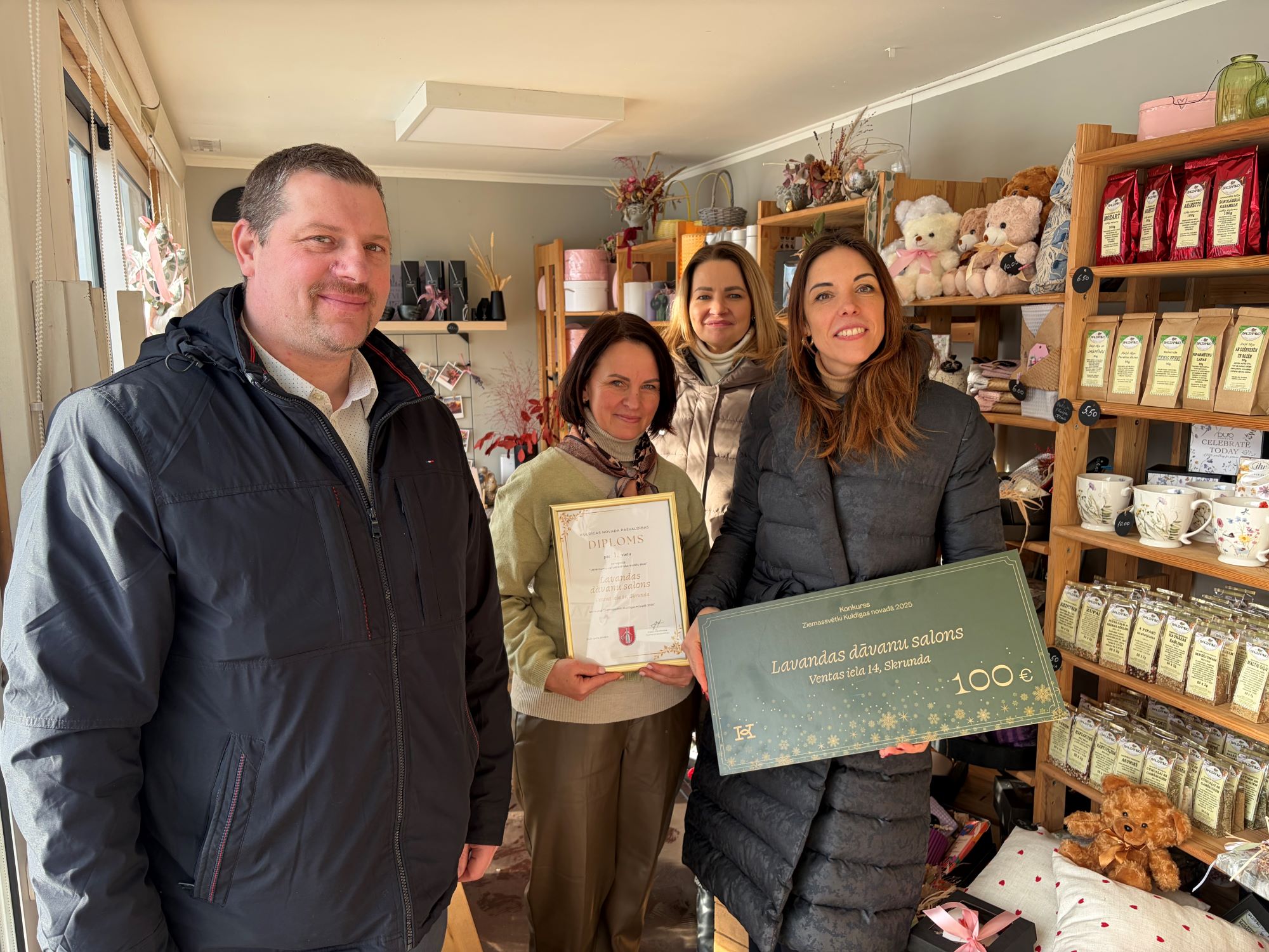 Noslēdzies konkurss “Ziemassvētki Kuldīgas novadā 2025”, kurā iedzīvotāji, uzņēmēji un iestādes tika aicināti iesaistīties svētku noskaņas radīšanā, izrotājot savus īpašumus un piesakot tos konkursam. Kuldīgas novada domes priekšsēdētājas vietnieks Artis Roberts un izpilddirektora vietniece Agnese Buka labāko noformējumu autorus godināja personīgi, sveicot ar Atzinības rakstu un naudas balvu un pateicās par radošumu un ieguldījumu novada rotāšanā.